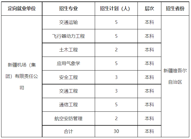 根据教育部及新疆维吾尔自治区有关招生工作规定,按照中国民航大学与新疆机场(集团)有限责任公司的定向就业招生协议内容,受新疆机场(集团)有限责任公司(以下简称定向就业单位)委托,中国民航大学2023年面向新疆维吾尔自治区开展定向就业招生,培养民航专业人才。